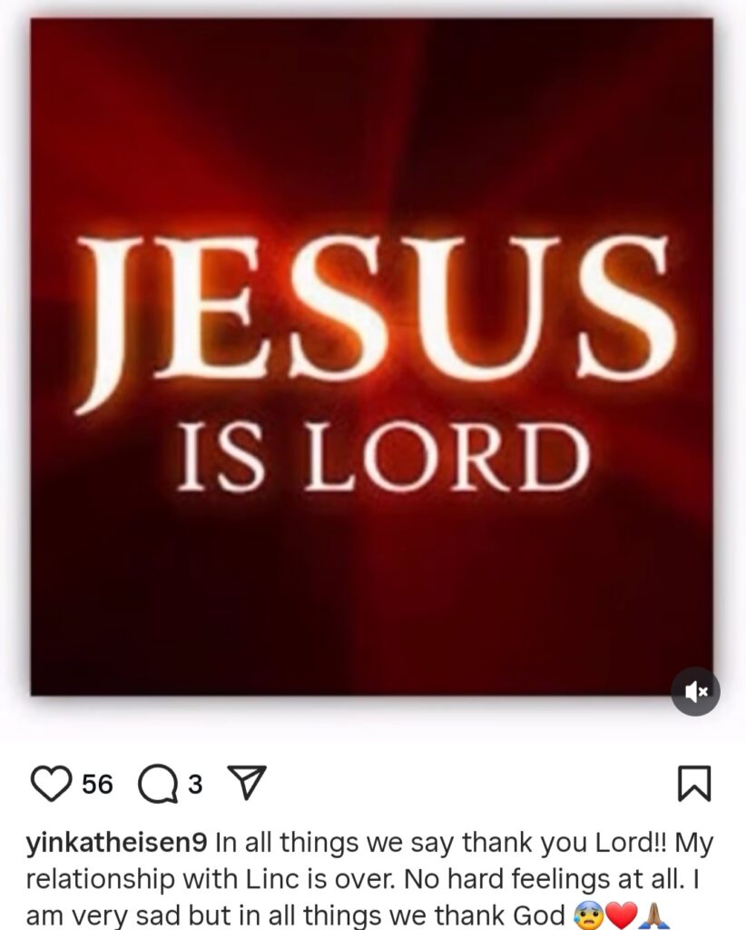 Yinka shared the news on her Instagram page. She wrote, “In all things we say thank you Lord! My relationship with Linc is over. No hard feelings at all. I am very sad but in all things we thank God.”