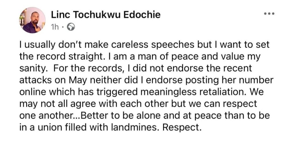 Before this, Linc had shared that he was choosing peace and walking away from what he described as a “landmine” relationship. His message came after Yinka made May Edochie’s phone number public, which led to serious backlash from May’s supporters.