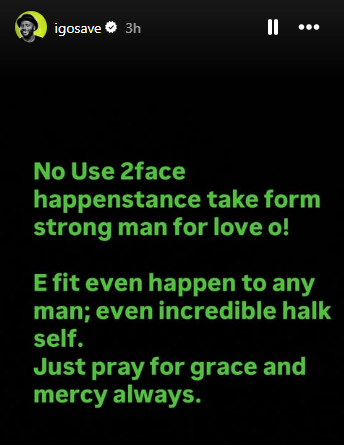 Reacting to it, I Go Save warned men not to use 2Face’s experience as a reason to act tough or distant in their own relationships. In his words, “No use 2Face happenstance take form strong man for love o!”