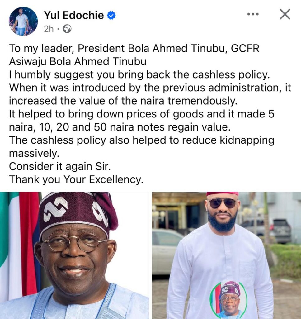 Nigerian actor, Yul Edochie, has called on President Bola Tinubu to bring back the cashless policy that was once introduced by the Central Bank of Nigeria (CBN).