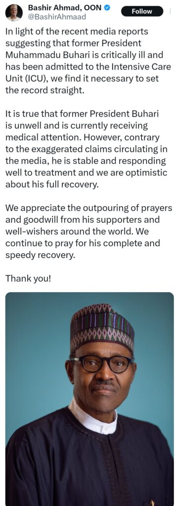 Bashir Ahmad, who served as Buhari’s Digital Media Aide during his presidency, has spoken out to correct rumours spreading online. Some media reports claimed Buhari was in critical condition and had been moved to the Intensive Care Unit (ICU).