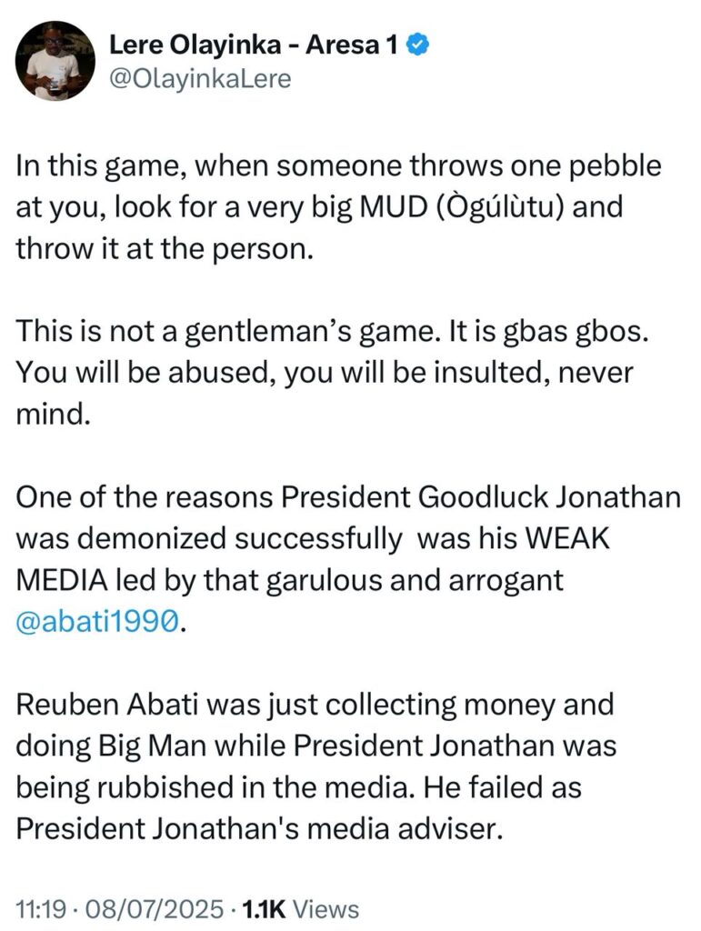Olayinka shared his thoughts on social media, saying that Abati didn’t do a good job when he was in charge of media and publicity for former President Goodluck Jonathan. He claimed that the weak media strategy during Jonathan’s presidency gave room for many people to speak badly about him.