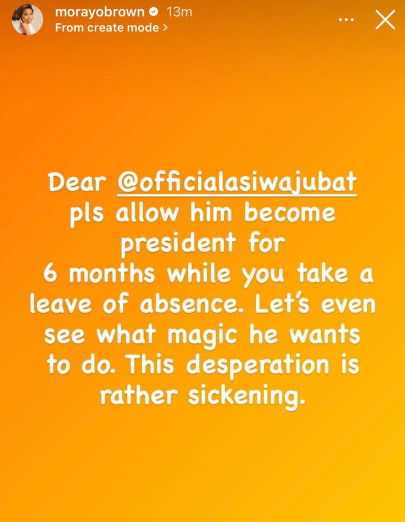 In her social media post, Morayo suggested that Tinubu should step down temporarily for six months. She asked him to take a break and let another unnamed man take over as president during that time.