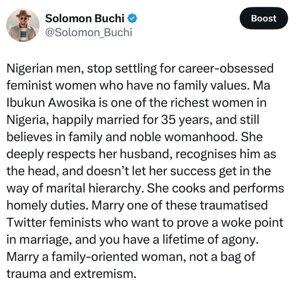 ‘’Nigerian men, stop settling for career-obsessed feminist women who have no family values. Ma Ibukun Awosika is one of the richest women in Nigeria, happily married for 35 years, and still believes in family and noble womanhood. She deeply respects her husband, recognises him as the head, and doesn’t let her success get in the way of marital hierarchy. She cooks and performs homely duties. Marry one of these traumatised Twitter feminists who want to prove a woke point in marriage, and you have a lifetime of agony. Marry a family-oriented woman, not a bag of trauma and extremism.”