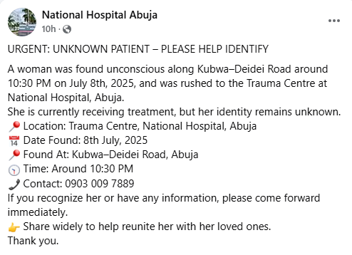 The hospital shared a message on Friday, July 11, 2025. They said the woman was found unconscious by the side of Kubwa–Deidei Road.