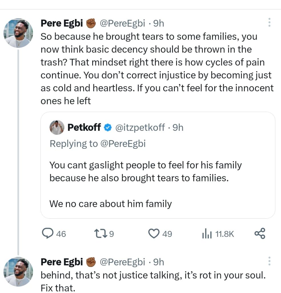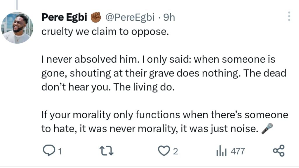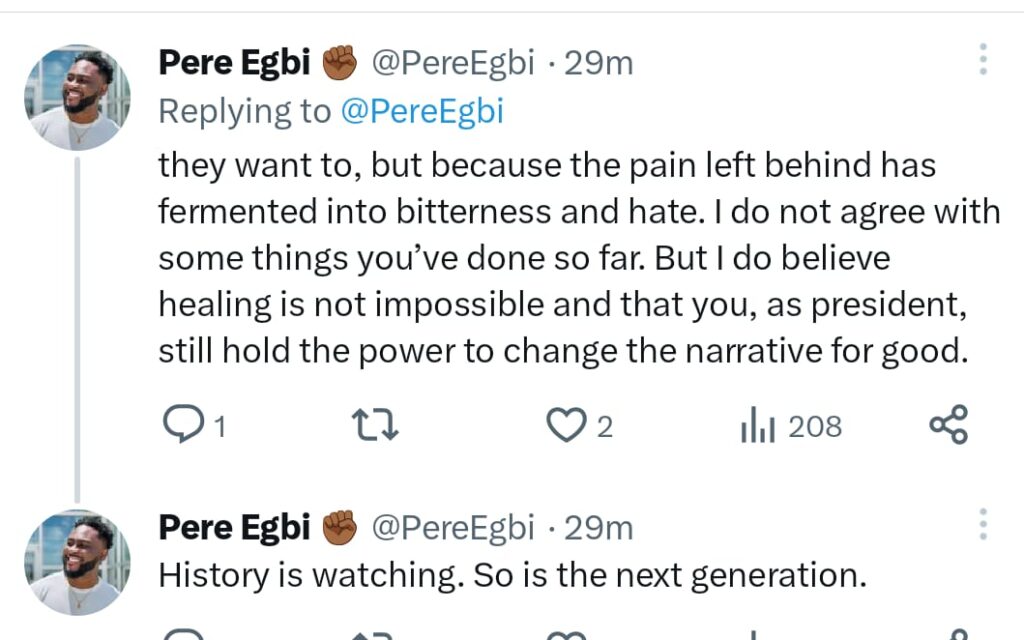 Pere ended the letter by saying that Nigeria won’t truly heal if people continue to act with the same anger that once hurt them. He encouraged everyone to choose kindness and a better way forward for the sake of the country.