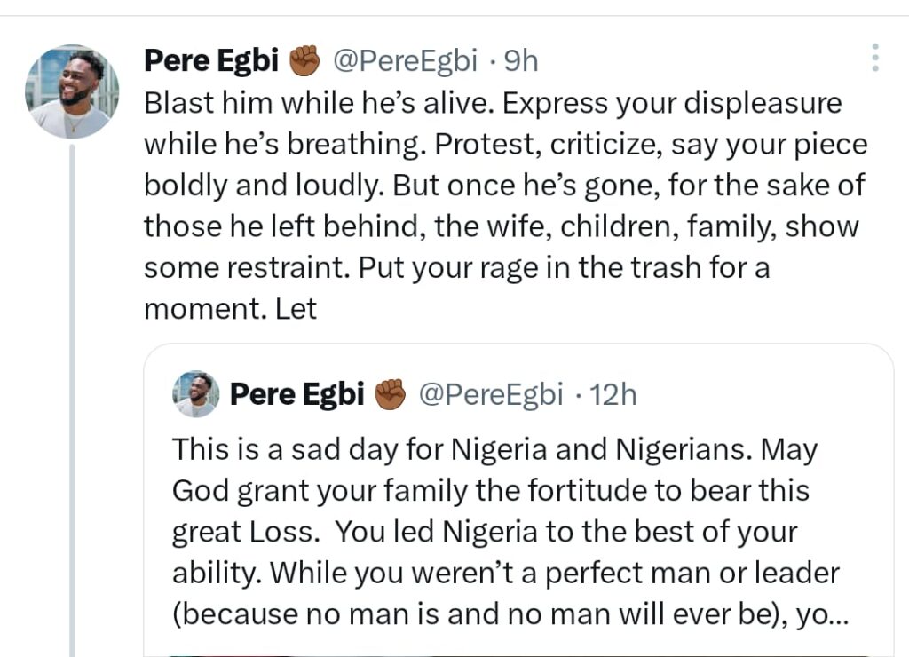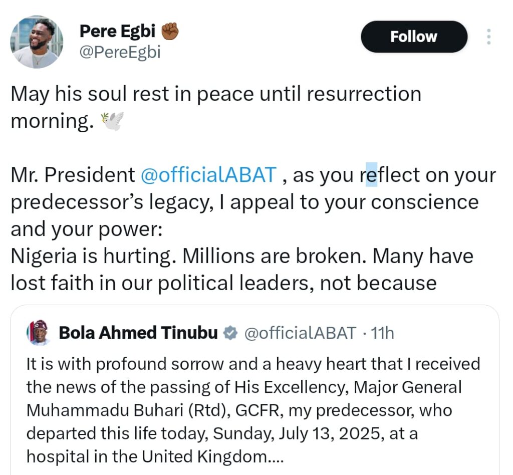 Apart from his message to the president, Pere also called out Nigerians who have been celebrating Buhari’s death. He said mocking someone after they’ve passed away is not right, no matter what they did while they were alive.