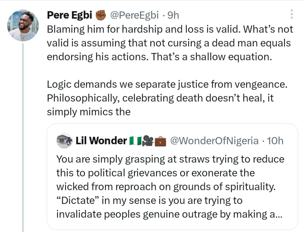 “Blast him while he’s alive. Express your displeasure while he’s breathing… But once he’s gone, for the sake of those he left behind… show some restraint,” he said in another post.