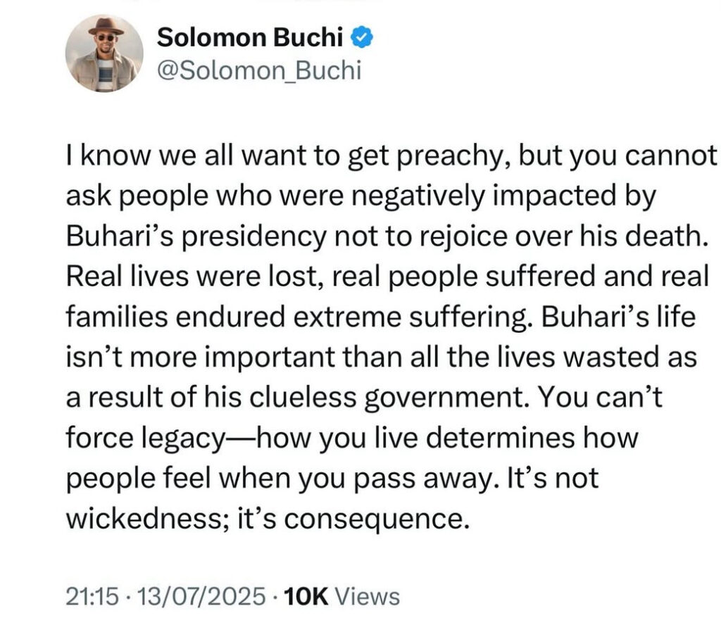 ‘’I know we all want to get preachy, but you cannot ask people who were negatively impacted by Buhari’s presidency not to rejoice over his death. Real lives were lost, real people suffered and real families endured extreme suffering. Buhari’s life isn’t more important than all the lives wasted as a result of his clueless government. You can’t force legacy—how you live determines how people feel when you pass away. It’s not wickedness; it’s consequence.”