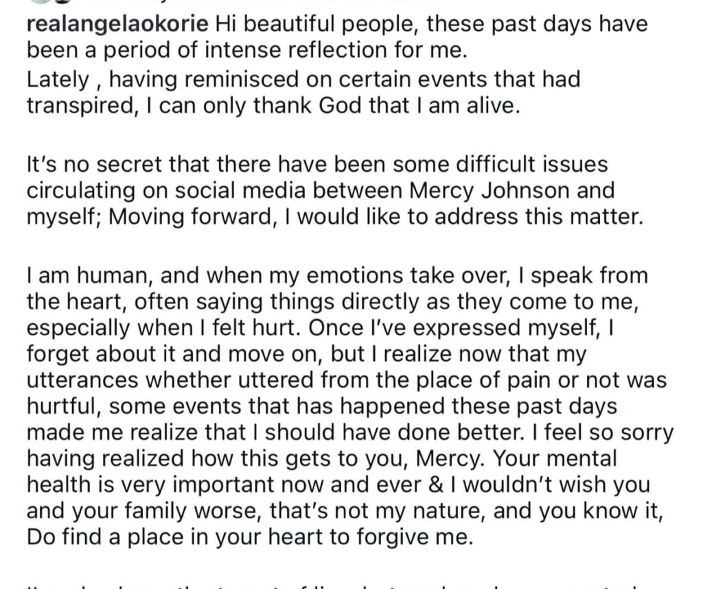 Speaking directly to Mercy Johnson, Angela explained that she often talks from a place of pain. She admitted that although her emotions were real, her words hurt others. She asked Mercy to forgive her.