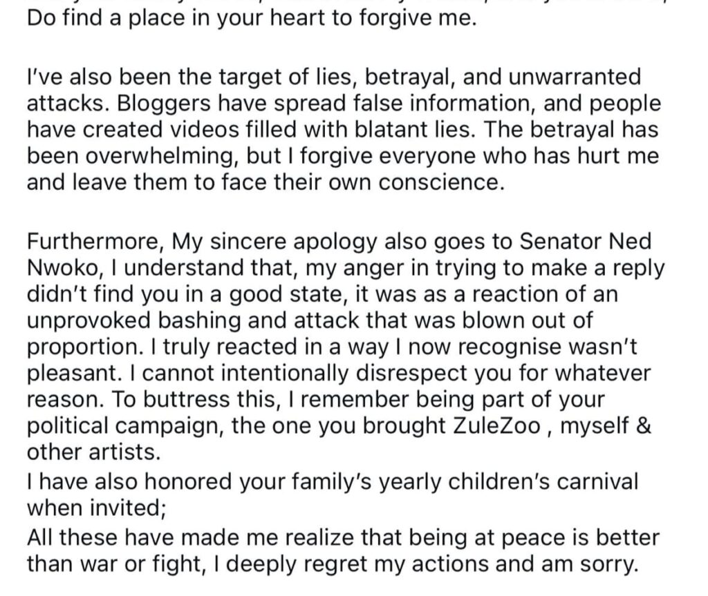 She also reached out to Senator Ned Nwoko with an apology. Angela said her reaction to something she saw as an attack was disrespectful and wrong.