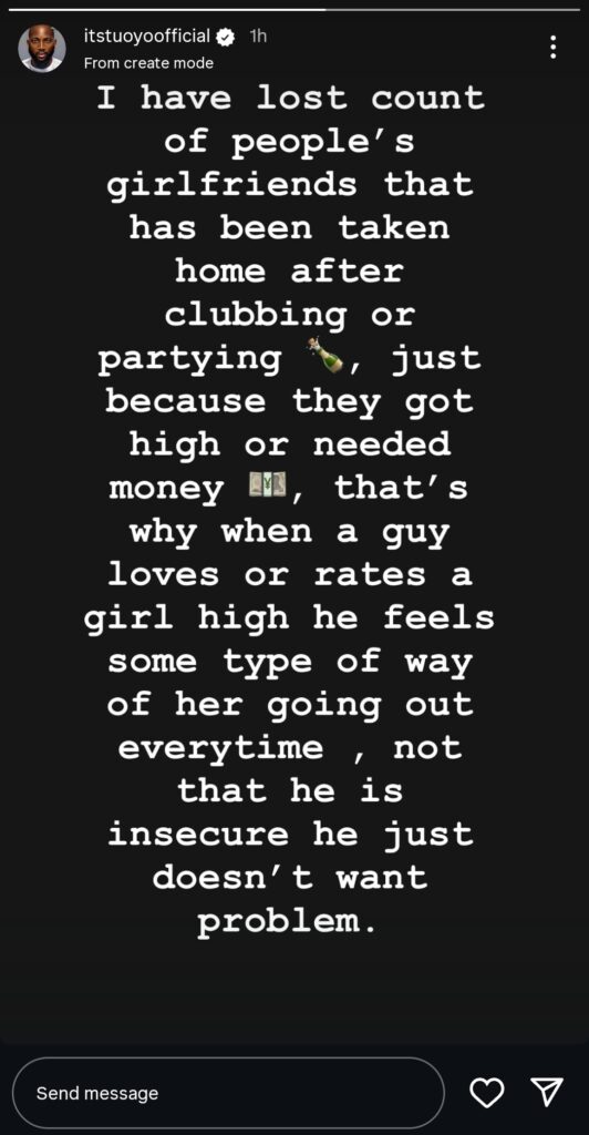 In his Instagram story, Tuoyo said he has seen many situations where men ended up taking home other people’s girlfriends after a night out. This often happens when the women get drunk or are in need of money.
