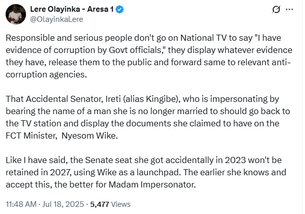 Reacting to this, Olayinka took to his X (formerly Twitter) page to criticize Kingibe. He said that anyone who truly has evidence should submit it to the public or proper authorities, instead of making such serious accusations on national television.