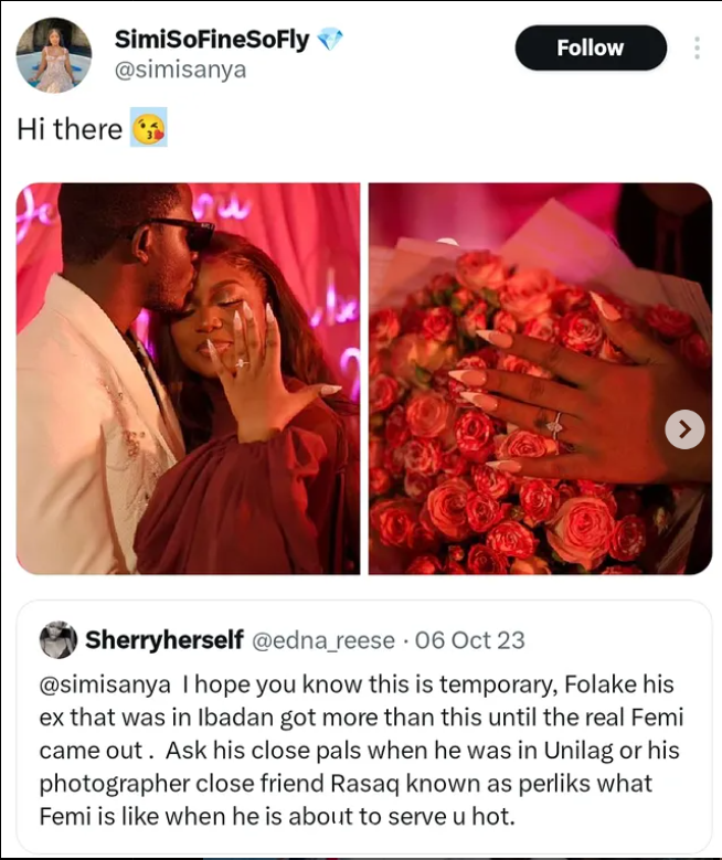 Social media influencer Simi Sanya has announced her engagement, and she used the opportunity to reply to someone who once doubted her relationship. In her latest post, she shared photos showing her engagement ring and flowers, along with the short caption: “Hi there 😘.” This was a subtle reply to a tweet made two years ago by a lady who predicted her relationship would not last.