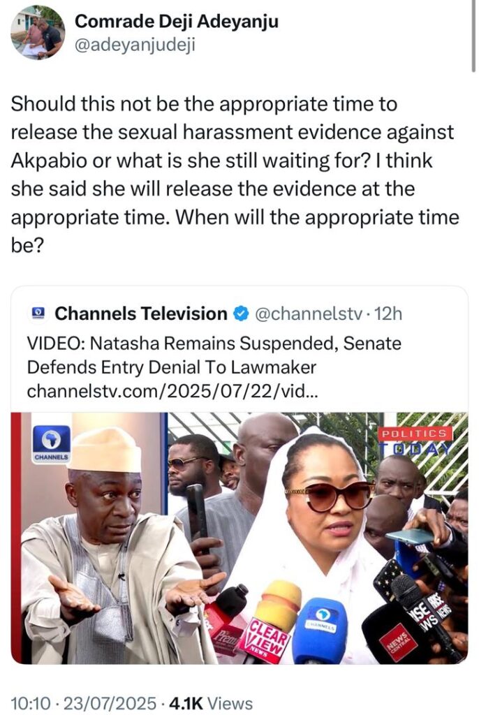 Nigerian human rights lawyer and activist, Deji Adeyanju, has called on Senator Natasha Akpoti-Uduaghan to release the evidence of sexual harassment she said she has against Senate President Godswill Akpabio.