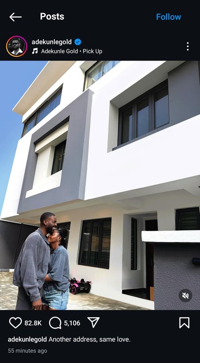He shared the news on his Instagram page, @AdekunleGold, where he posted a photo of the beautiful house and a cute picture with his wife, Simi. He added a short caption that said, “Another address, same love.”
