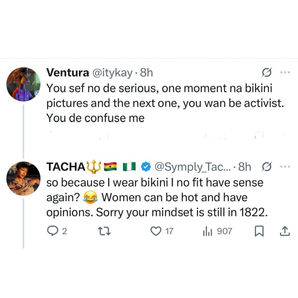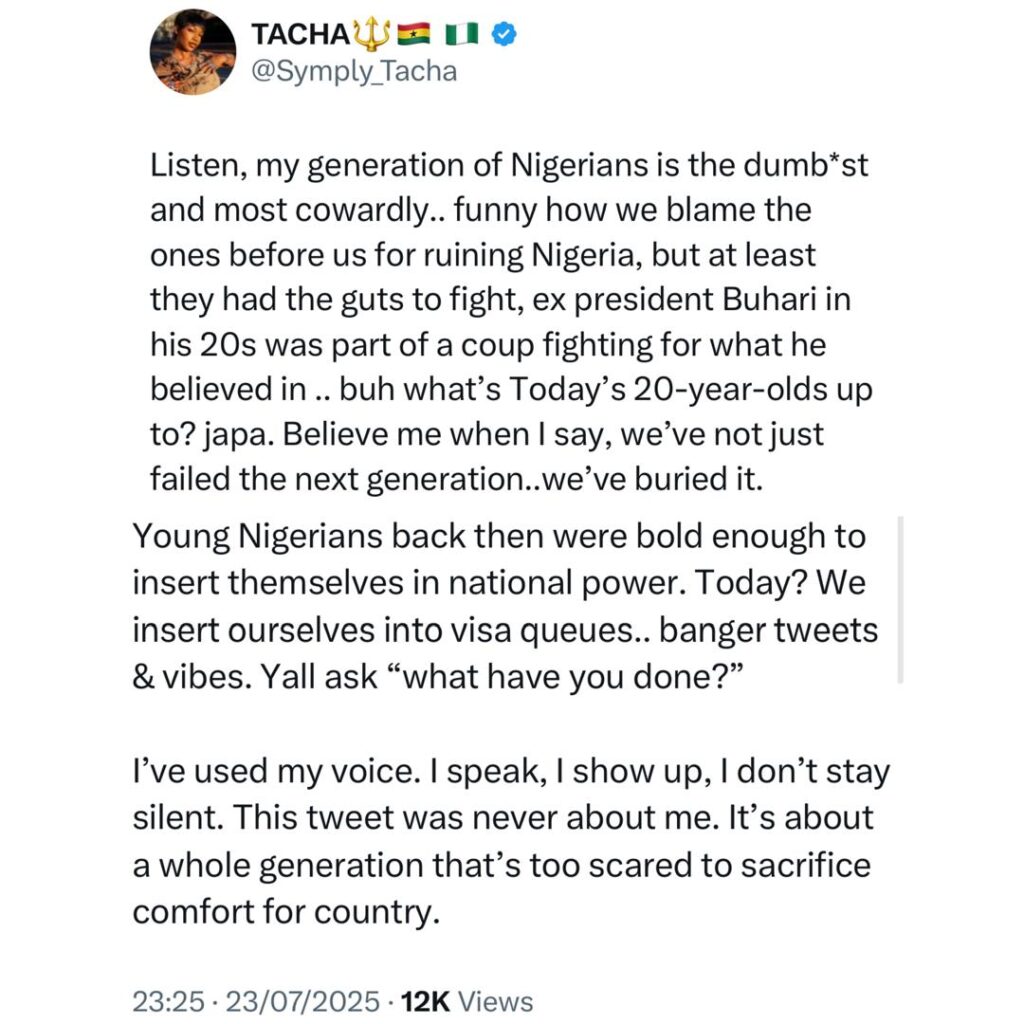 Reality TV star Tacha has strongly criticized her own generation of Nigerians, calling them the most cowardly and least intelligent. She made this statement on her X account, where she often talks about national issues.