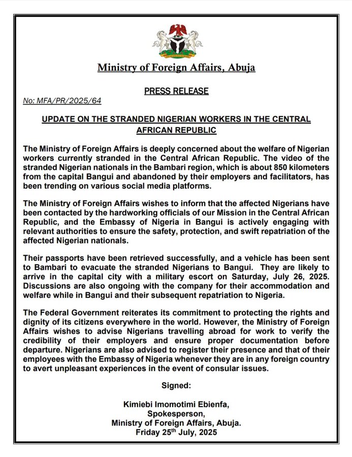 In a statement shared on Friday, July 25, 2025, the Ministry of Foreign Affairs said that Nigerian officials in Bangui, the capital of CAR, have contacted the affected citizens.