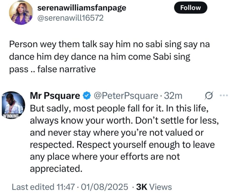 Singer Peter Okoye, also known as Mr P, has shared a powerful reminder about self-respect and knowing your value.