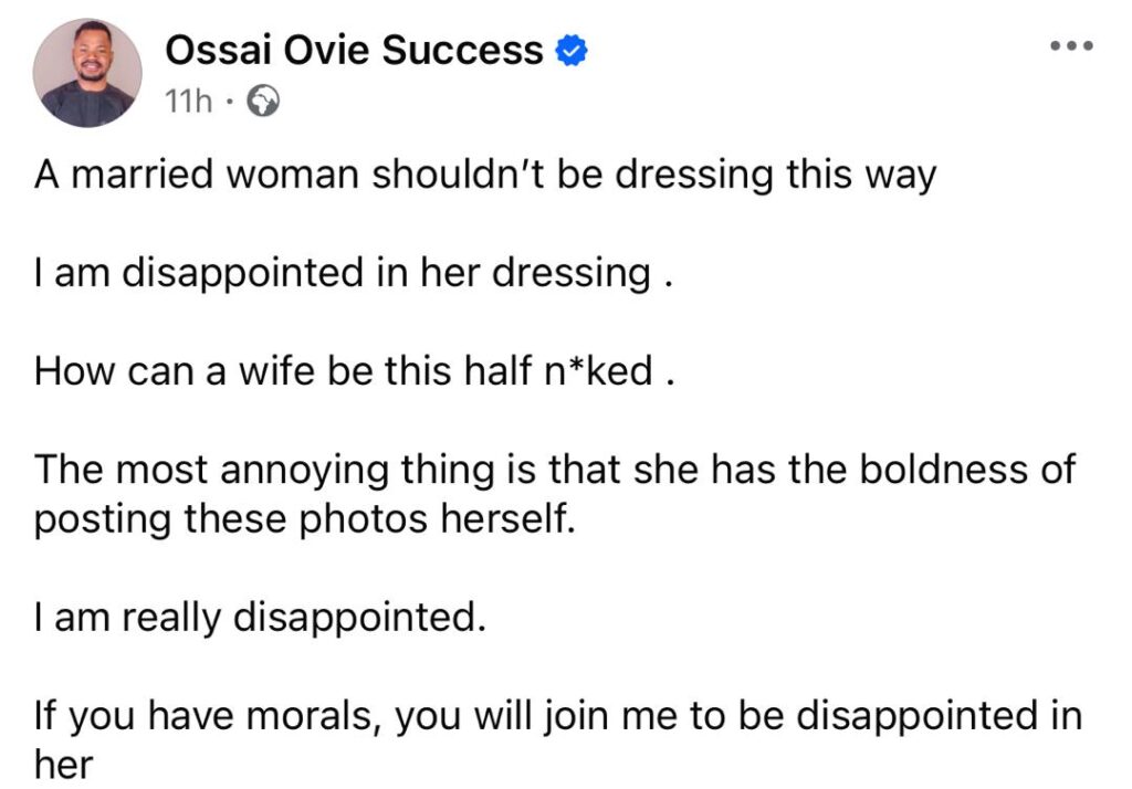 In his post, Ossai explained that he believes married women should dress modestly and avoid wearing clothes that expose too much. He felt that ripped jeans are not suitable for someone who is married and publicly condemned the outfit as inappropriate.