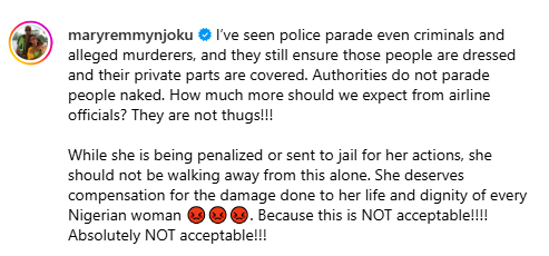 Nollywood actress and filmmaker Mary Remmy Njoku has spoken out against the handling of Comfort Emmanson, an Ibom Air passenger accused of attacking a crew member. Njoku condemned both the alleged manhandling and the release of a video showing Emmanson in an indecent state.