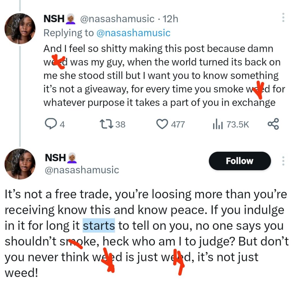 “At first, marijuana gives you a temporary escape, wrapping you in comforting illusions,” she wrote. “It feels good for a moment, but eventually, you can’t keep running from reality. Each time you smoke, you’re giving a piece of yourself away.”