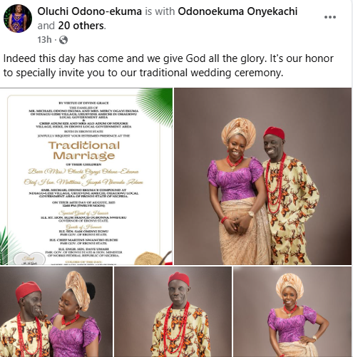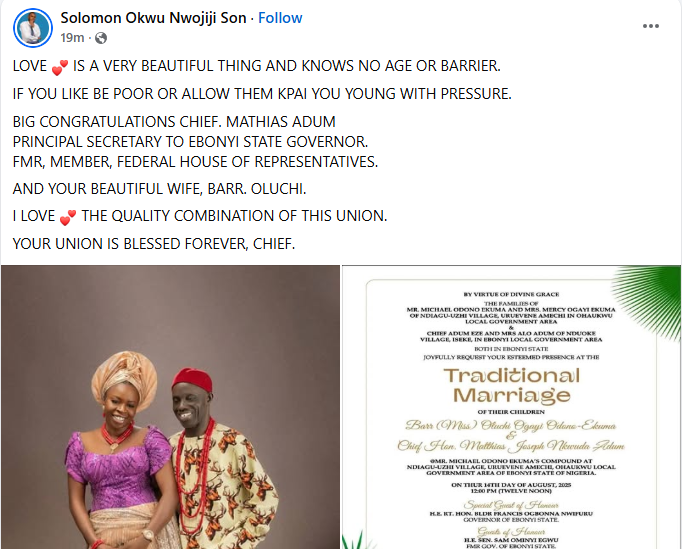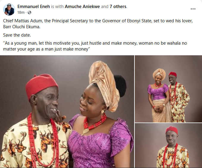 One Facebook user, Emmanuel Eneh, commented: “Chief Mathias Adum is set to marry Barr Oluchi Ekuma. This should inspire young men: work hard, earn well, and love knows no limits. Age doesn’t matter if you are financially stable.”