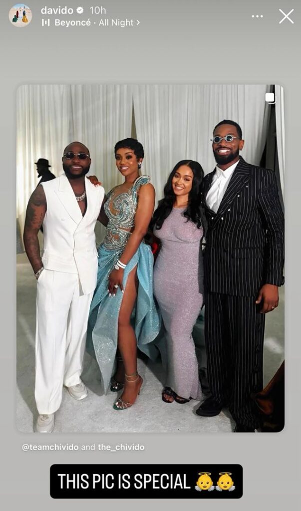 On his social media page, Davido posted the photo where he stood beside his wife Chioma, with Dbanj and his wife also smiling in the frame.