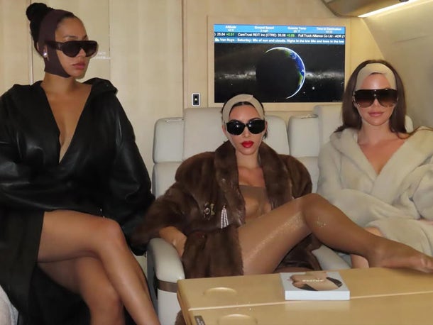 Traveling privately with her sister Khloé Kardashian and friend La La Anthony, Kim started out wrapped in a luxurious fur coat. Later, in the jet bathroom, she posed in revealing SKIMS shapewear, showing off the brand’s latest designs.