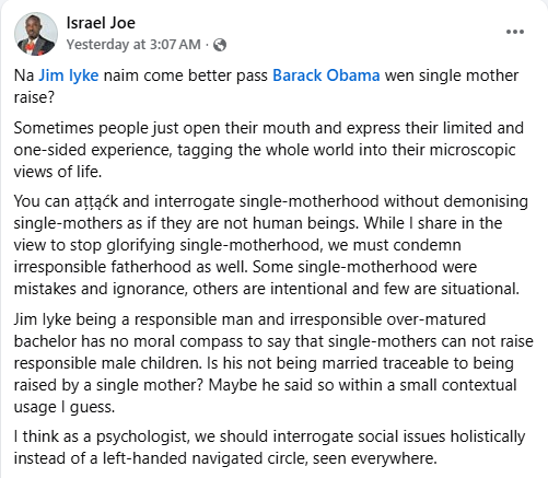 Responding on Facebook, Israel Joe called Jim Iyke an “irresponsible over-matured bachelor” and said he has no right to make such statements. Joe argued that Iyke is not better than former U.S. President Barack Obama, who was successfully raised by a single mother.