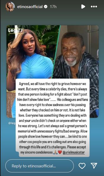 Etinosa, however, disagreed with Uriel’s remarks. In a post on Instagram, she explained that Adibe’s colleagues and fans have every right to mourn him, even if they did not visit him while he was sick.
