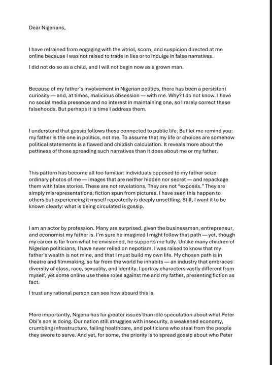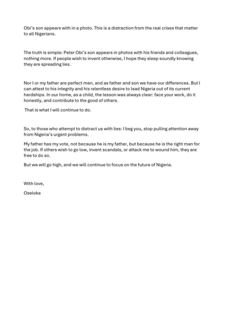 Oseloka Obi, the son of Labour Party’s presidential candidate Peter Obi, has spoken about the online stories linking his private life to politics. He called them “distractions” from Nigeria’s real problems.