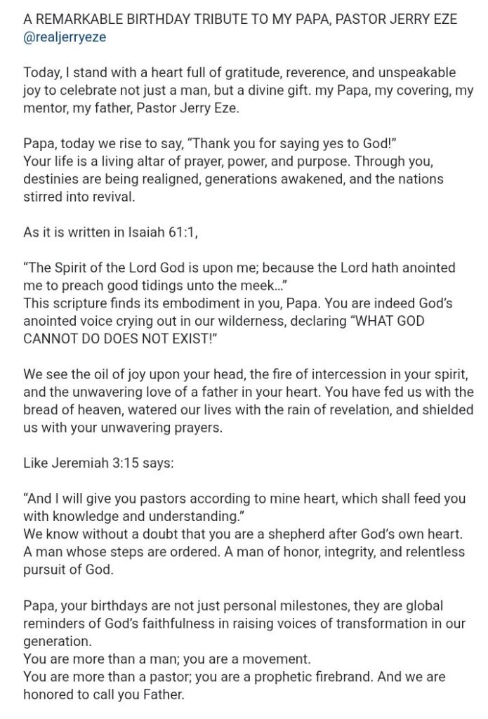 She added that Pastor Jerry’s birthdays are not just personal milestones but global reminders of God’s faithfulness in raising voices of change. Tonto concluded by calling him more than a man, more than a pastor, but a prophetic firebrand whose impact is felt across the world.