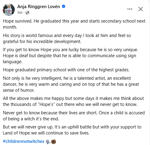 While celebrating Hope’s success, Anja also reflected on the many children who are not as lucky. Many accused of witchcraft never survive or get the chance to be seen and loved.