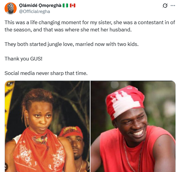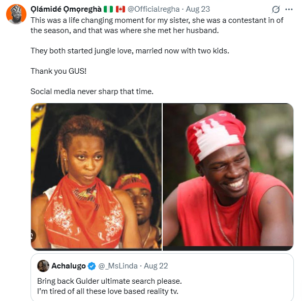Two contestants who met on the reality show Gulder Ultimate Search are now happily married. The lady’s brother, Olamide Omoregha, shared the exciting news over the weekend on X.