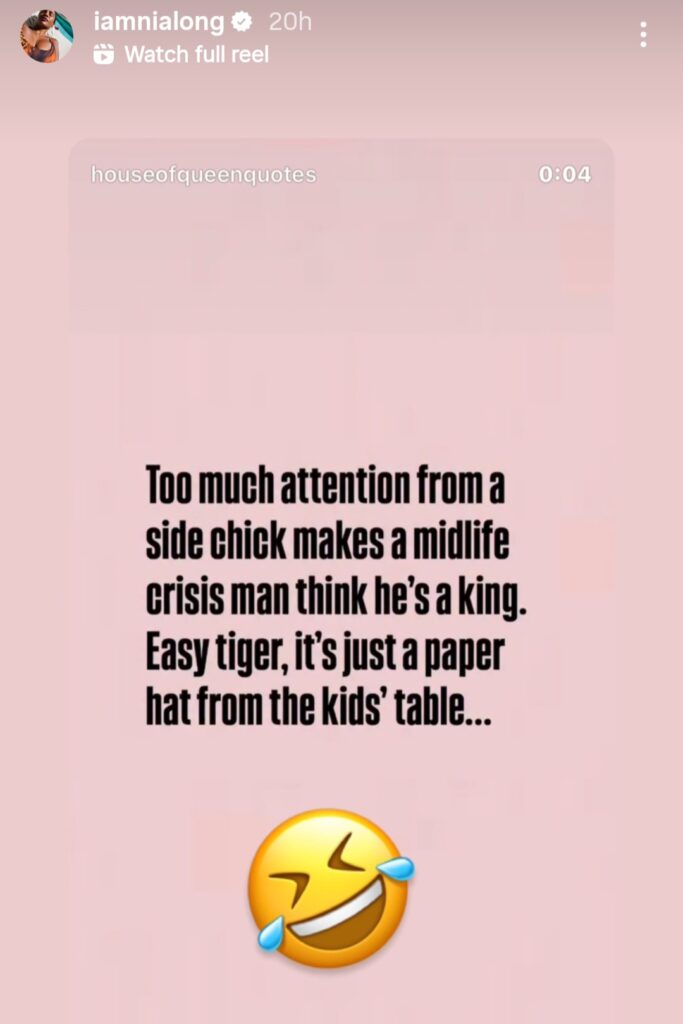 In her post, she wrote, “Too much attention from a side chick makes a midlife crisis man think he’s a king. Easy tiger, it’s just a paper hat from the kids’ table.”