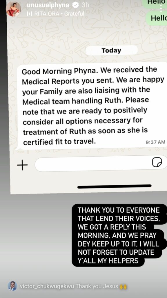 In the message sent to her, Dangote Group stated that they are pleased her family is working closely with the doctors treating Ruth and promised to explore all possible options for her treatment once she is cleared to fly.
