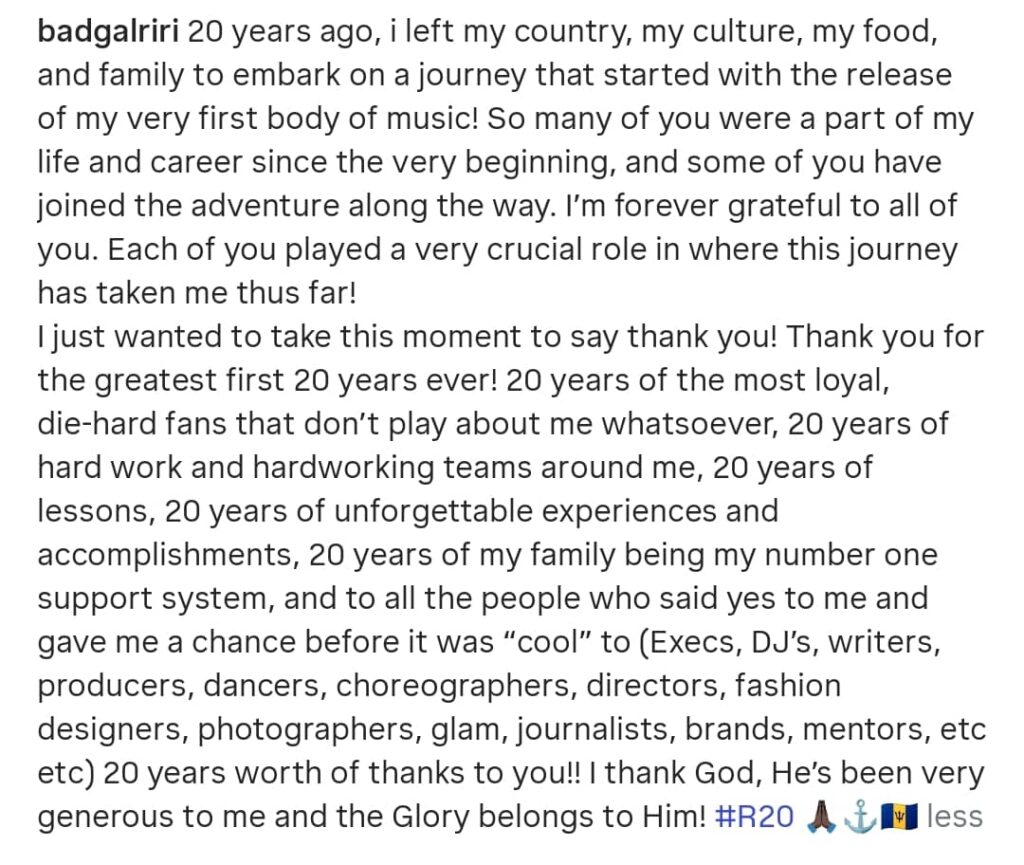 Superstar Rihanna took to social media to reflect on her 20-year journey in music, celebrating the release of her first project and everything that came after.