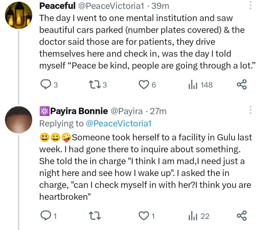 Another social media user shared a humorous incident at a mental health center in Gulu. A young woman walked in and said she thought she was “mad” and wanted to spend a night at the facility to see if she felt better the next day.
