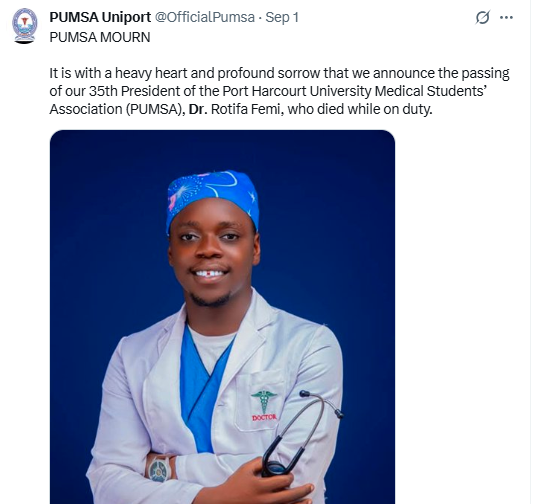 Dr. Rotifa was a former President of the Port Harcourt University Medical Students’ Association and had already registered with the UK’s General Medical Council, awaiting his placement abroad. His untimely passing has left many heartbroken.