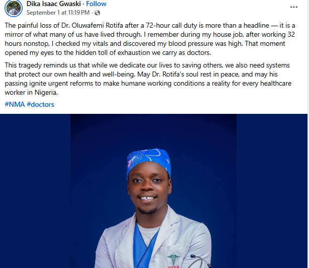 A young resident doctor at the Rivers State University Teaching Hospital, Dr. Femi Rotifa, has died after working three days in a row without rest.