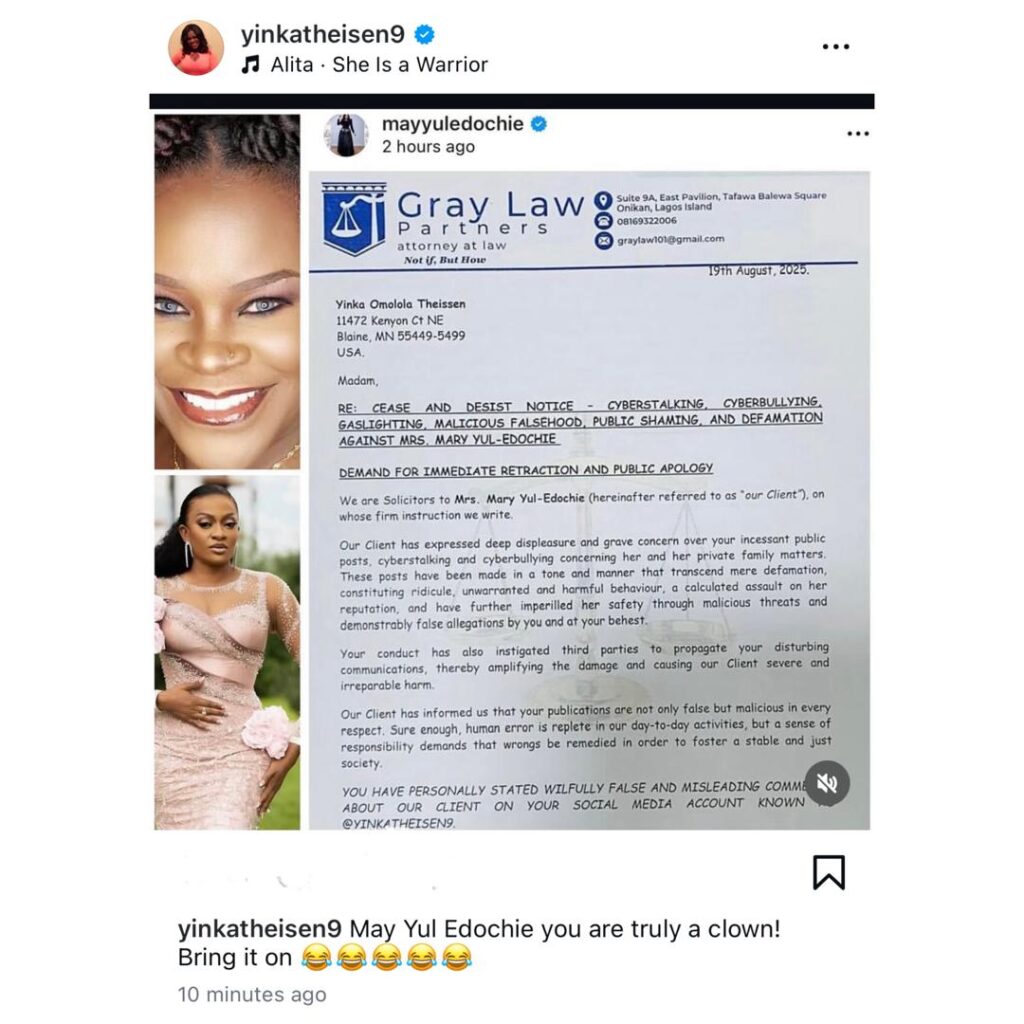Linc Edochie’s former wife, Yinka Theisen, has replied to the cease-and-desist letter sent to her by businesswoman May Yul-Edochie.