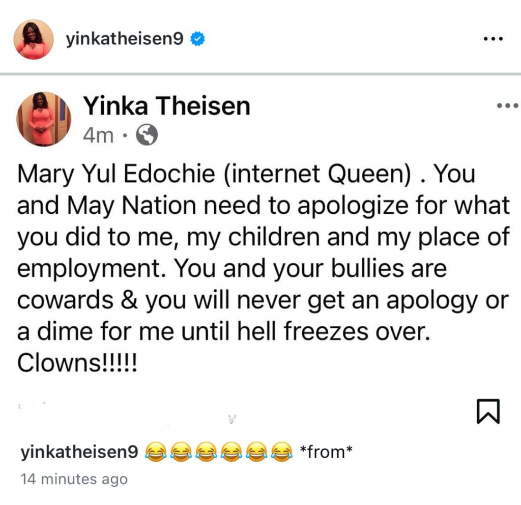Yinka, however, did not take the letter lightly. Responding on her Instagram page, she described May as a clown. She added that May should forget about getting an apology or a dime from her.