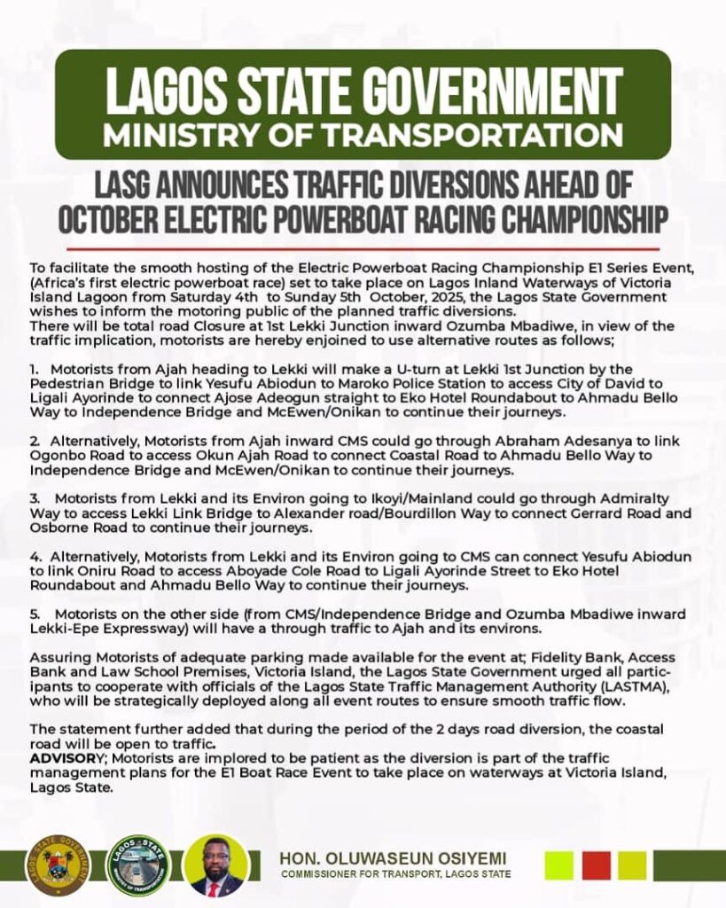 The Lagos State Government has announced a temporary closure of parts of the Lekki Expressway to allow smooth hosting of the upcoming electric power boat race. The event, which will showcase modern eco-friendly watercraft, is expected to attract both local and international participants, boosting tourism and entertainment in the state.