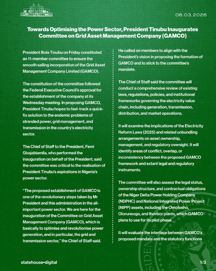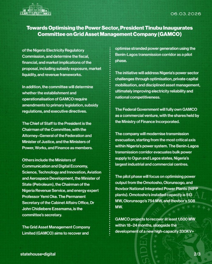 President Bola Ahmed Tinubu has inaugurated a committee tasked with overseeing the operations and management of the Grid Asset Management Company. The initiative aims to improve efficiency and accountability in the country’s power infrastructure.