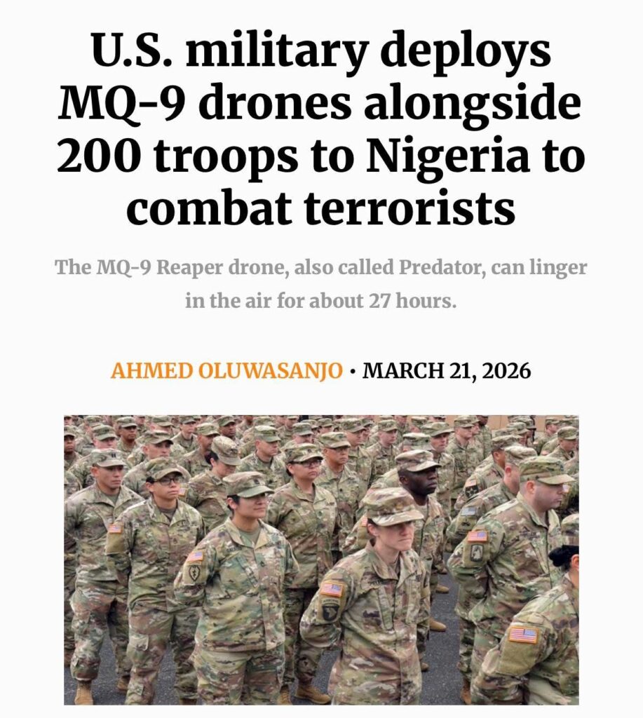 The United States military has deployed advanced MQ-9 drones alongside about 200 troops to Nigeria to support ongoing security operations. The move is aimed at helping Nigerian forces tackle insurgent groups operating in the northern region.