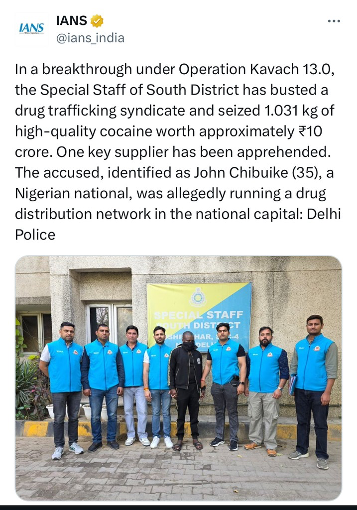 A major drug bust in New Delhi has led to the arrest of a Nigerian national and the seizure of cocaine worth about ₦1.49 billion. The operation was carried out by the Delhi Police in the Mehrauli area.