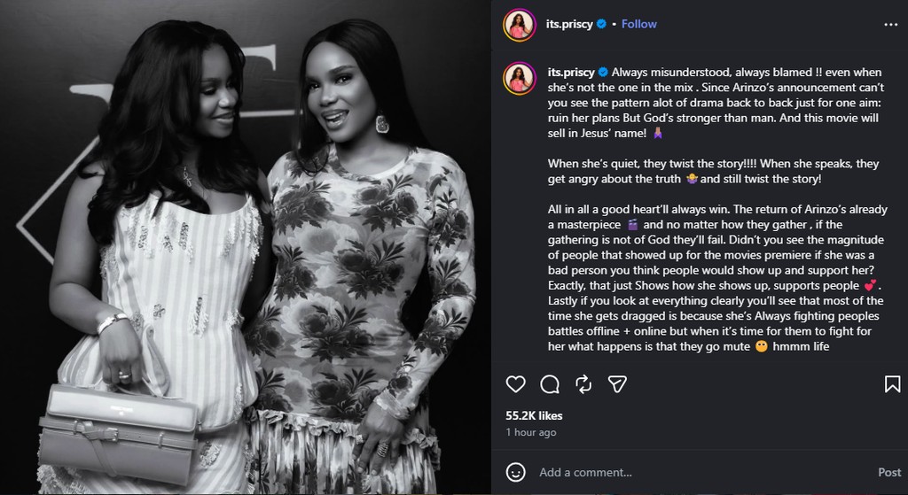 Priscilla Ojo has come out to defend her mother, Iyabo Ojo, saying she is always misunderstood and blamed even when she is not involved. She said that since the announcement of Arinzo, there has been constant drama, which she believes is an attempt to ruin her mother’s plans, but she trusts that God will make the movie successful.